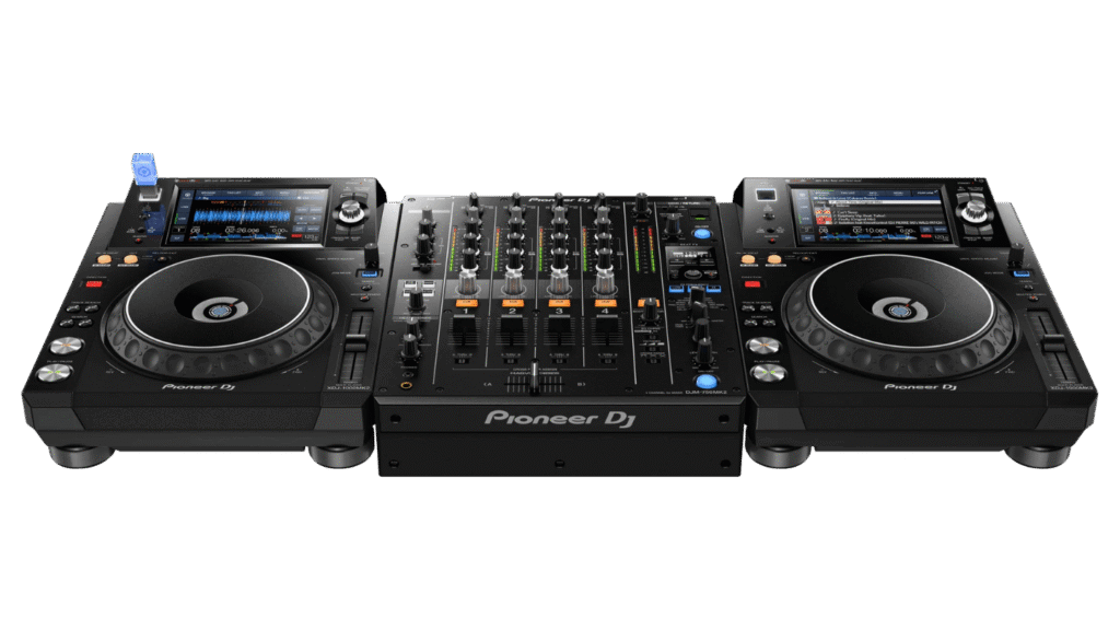 Headphones, music on a stick or HDD, or your record collection. The setup is already done, the equipment is turned on and ready to play. To avoid problems, we recommend using a stick of maximum 32GB and scanning the music in Rekordbox and then exporting it to the stick.